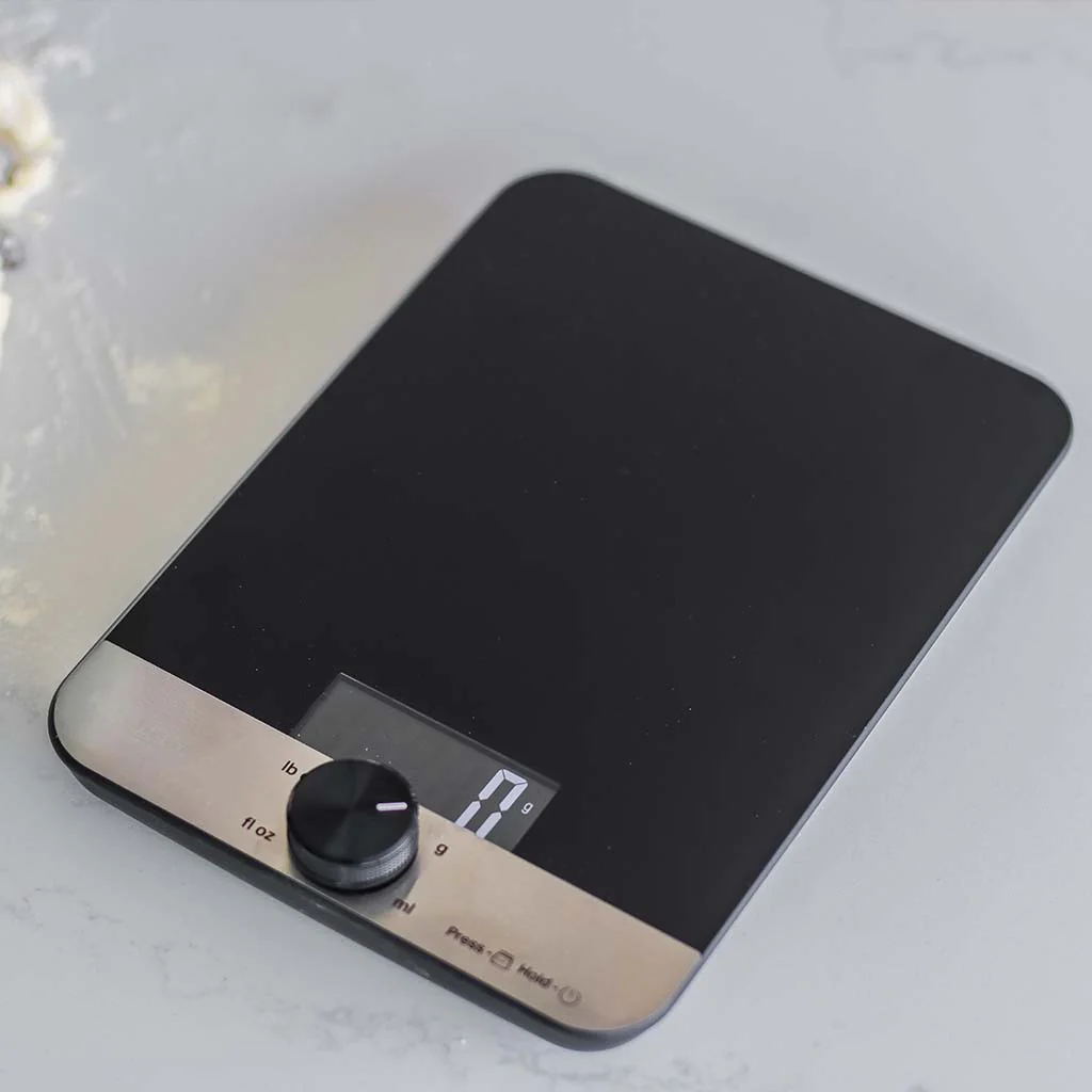 La Báscula digital de cocina KitchenAid es un utensilio imprescindible en tus recetas, Su diseño, inspirado en los hornos eléctricos de la marca, cuenta con el bonito detalle del botón giratorio con el que podrás ajustar las unidades de medida.