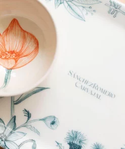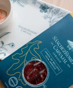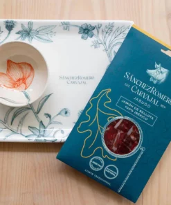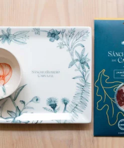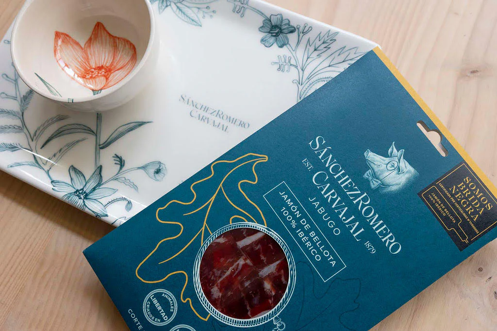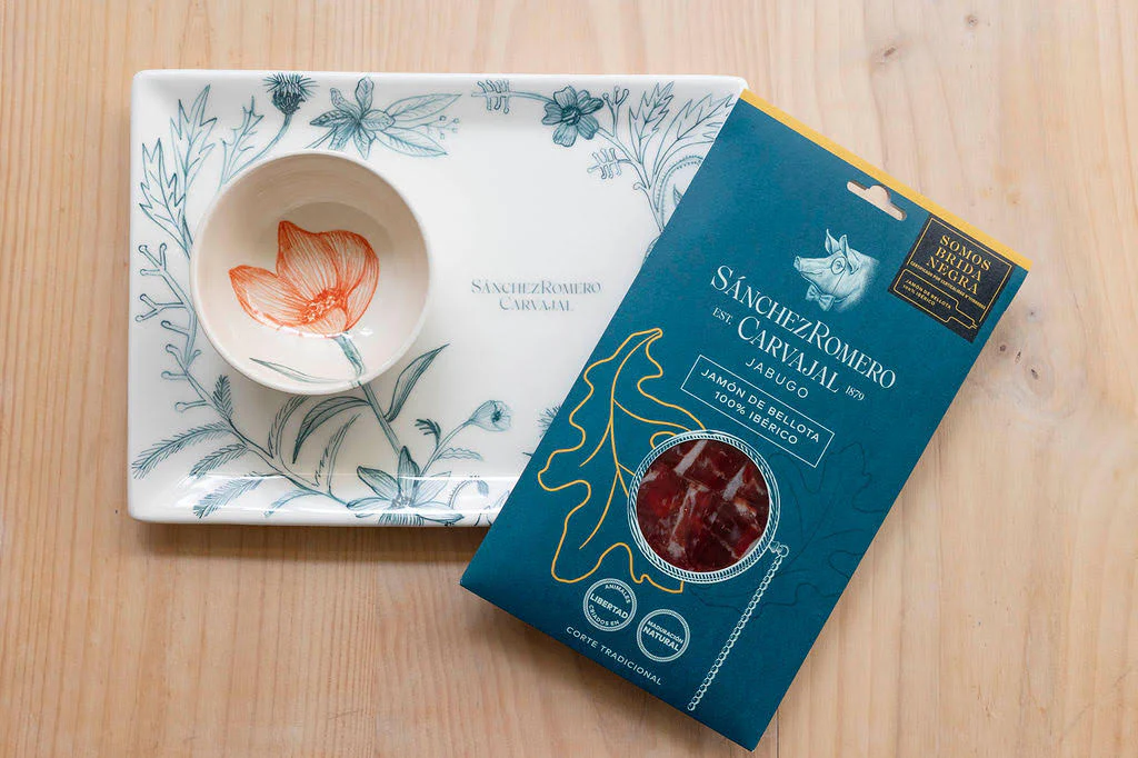 Colaboración especial de edición limitada que incluye un sobre de Jamón de Bellota 100% Ibérico Sánchez Romero Carvajal y dos piezas de cerámica pintadas a mano por la artista Nuria Blanco: una bandeja en formato rectangular para facilitar el emplatado del loncheado y un cuenco redondo para los picos.