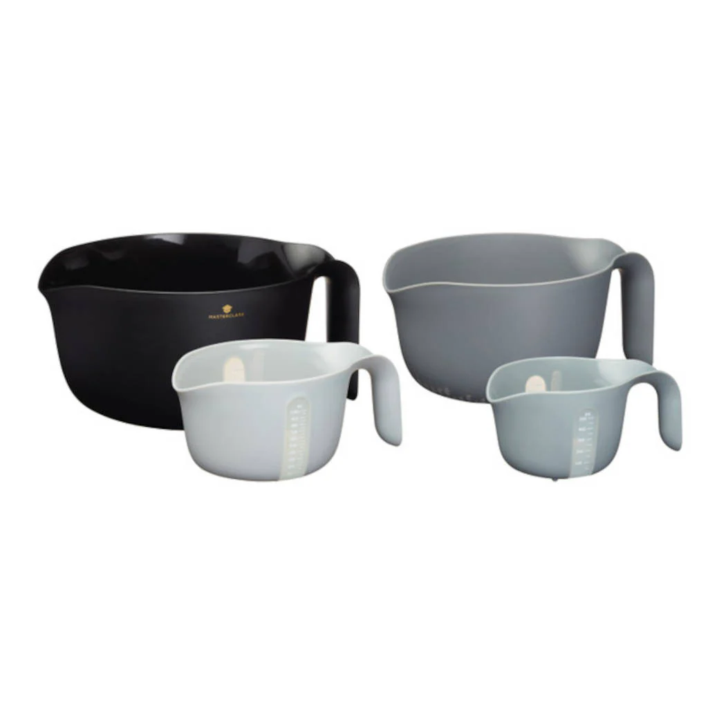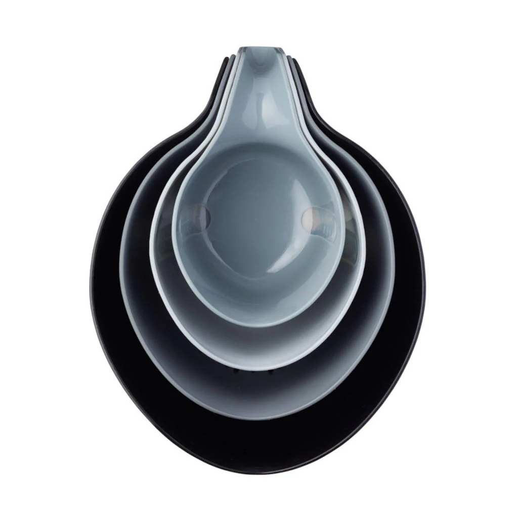 Cada pieza segura para alimentos cuenta con un asa ergonómica de fácil agarre y un amplio borde para verter, lo que te permite usarlas cómoda y seguramente. Aunque se almacena con facilidad, su atractivo diseño hace que quieras mantenerlo a la vista. El bol principal está hecho de plástico negro mate de primera calidad y las otras tres piezas presentan colores clásicos hermosamente degradados del primero.