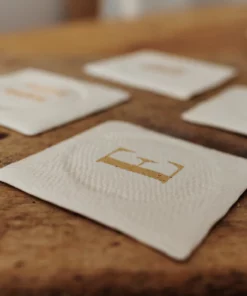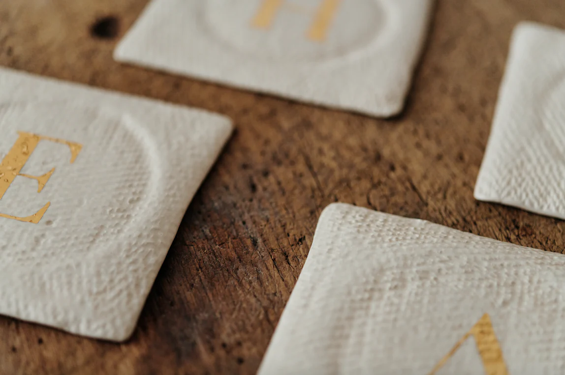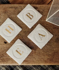Posavasos en cerámica blanco roto personalizado con inicial en dorado pintada a mano. Para indicarnos la letra a pintar deberás hacerlo en el proceso de compra en “indicaciones al vendedor”. SE VENDEN POR UNIDAD