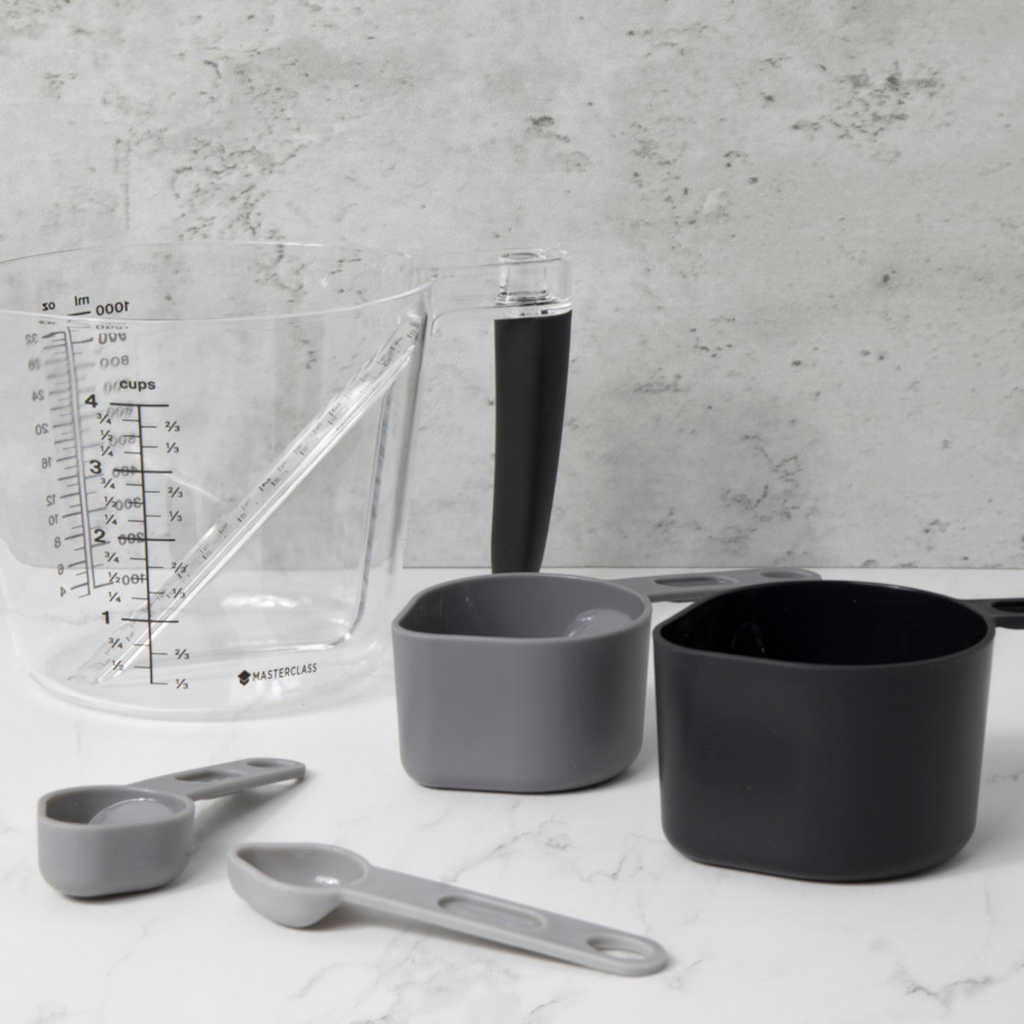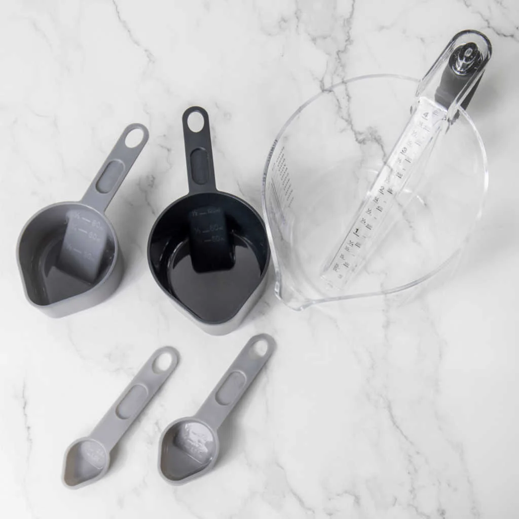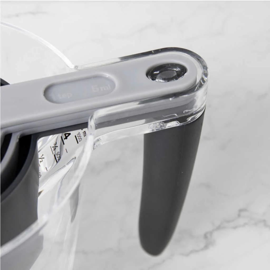 Los vasos y las cucharas presentan incrementos en ángulo fáciles de leer, mientras que la medida inclinada de la jarra te permitirá medir con precisión incluso en superficies inclinadas.