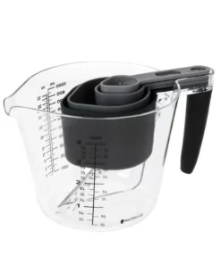 Los vasos y las cucharas presentan incrementos en ángulo fáciles de leer, mientras que la medida inclinada de la jarra te permitirá medir con precisión incluso en superficies inclinadas.