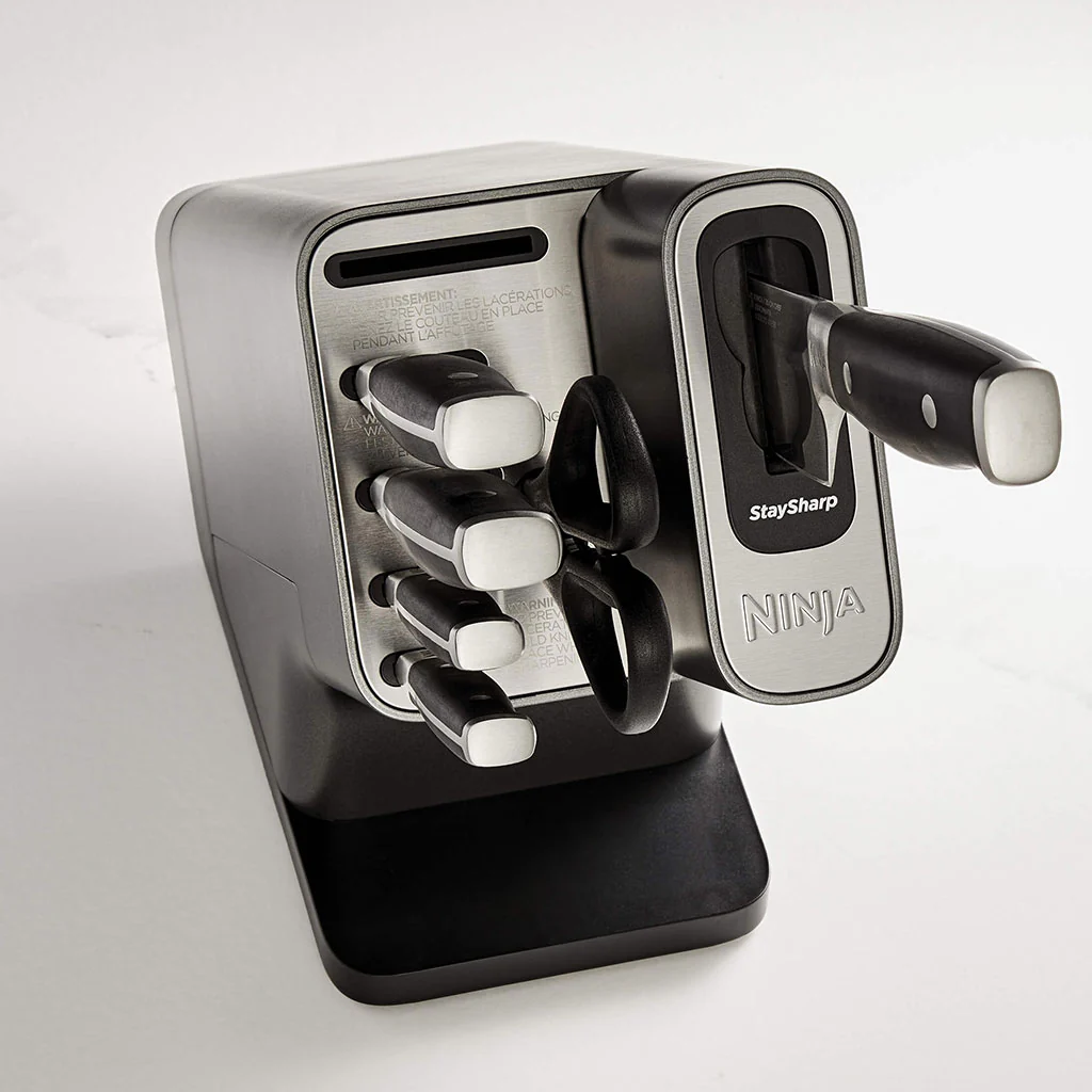 NOTA: El afilador integrado StaySharp está diseñado únicamente para cuchillos de filo recto Ninja®. No deben afilarse los cuchillos dentados o de sierra, ni las tijeras de cocina. Tampoco deben afilarse los cuchillos de otras marcas, ya que podrían dañarse y dañar el afilador.