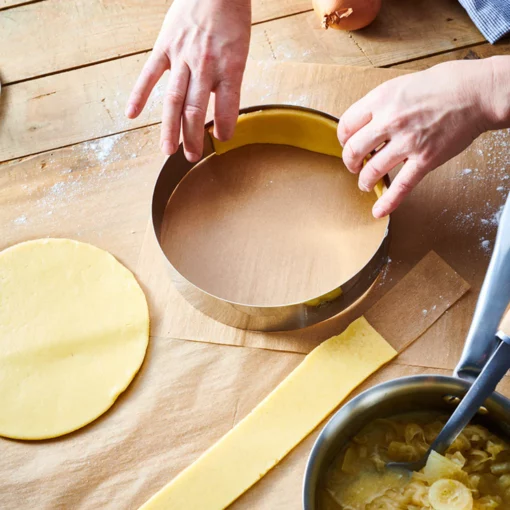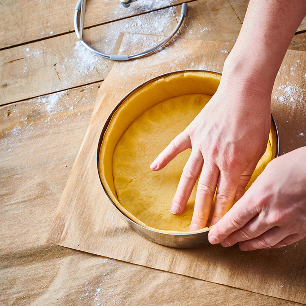 - Puede ser sustituto de otros moldes: solo se debe colocar el aro sobre una bandeja de horno antiadherente o sobre papel de hornear, e introducir la masa extendida dentro, haciendo que suba por los bordes del aro.