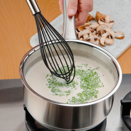 También es perfecto para remover las salsas o cremas que cocines en el fuego, ya que el extremo curvado donde se cruzan las seis varillas, está pensado para llegar a cualquier rincón del cazo, evitando que lo que estés removiendo se pueda pegar. De esta forma no se quemará nada y al ser las varillas de silicona, ¡tampoco rallarás nada!