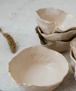 Piezas de cerámica en blanco roto con filo dorado. Perfectos para servir un picoteo o un gazpacho a juego con la vajilla ondulada. Grabado del logo en la parte inferior. Precio por unidad