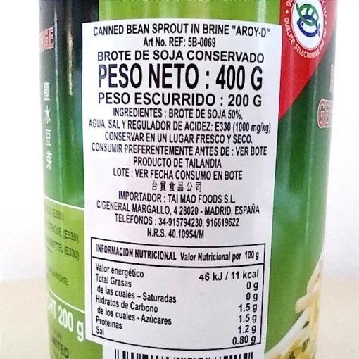 Lata de 400g , 200g peso neto escurrido , procedente de Tailandia o China según disponibilidad