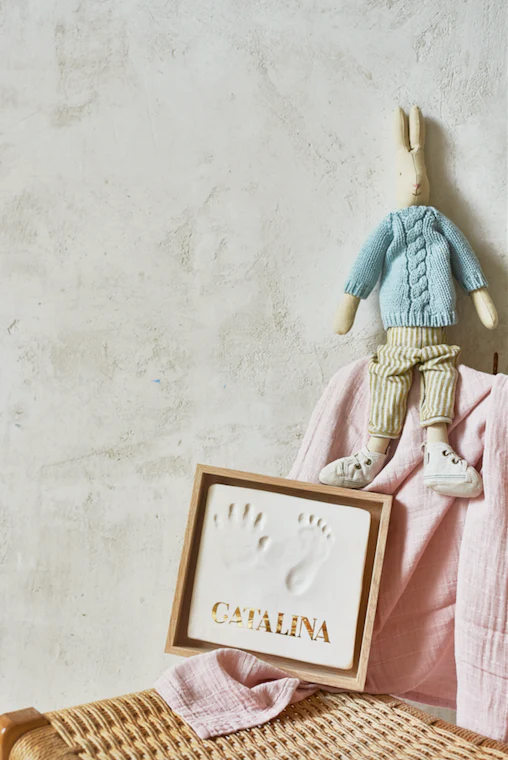 Placa de cerámica en color blanco roto con las huellas del bebé y su nombre en dorado pintadas a mano. Enmarcada al aire sobre marco de madera de roble.