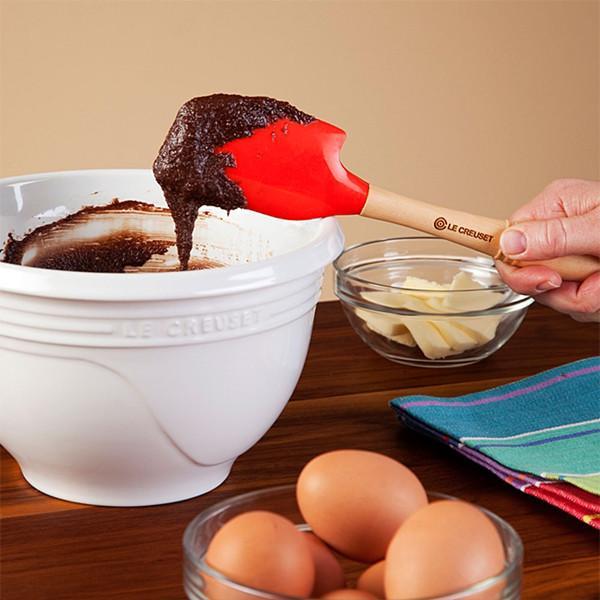 ¡La espátula perfecta para el día a día en tu cocina! Se trata de la Espátula Le Creuset con mango de madera y cabezal de silicona. Es perfecta para mezclar, servir, sofreír, saltear o raspar tu cocotte o sartén, ya que su cabezal de silicona flexible nunca dañará tus utensilios. Es extraíble, para facilitar su limpieza, y no absorbe olores ni sabores de alimentos.