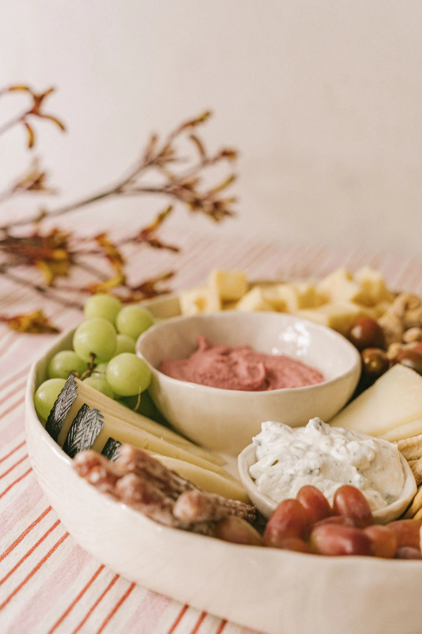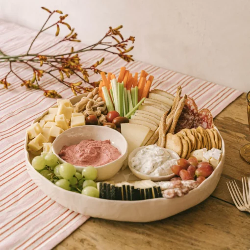 Fuente para servir picoteo y dips. Consigue de una manera muy fácil presentar un picoteo. Desde quesos, nachos, frutos secos, frutas, panecillos, embutido, crudités, salsas… Con los bowls fijos y el espacio te será más fácil colocar y ordenar las cosas quedando bien presentado. Fuente en blanco roto de 34cm de diámetro aprox y 5cm de profundidad.