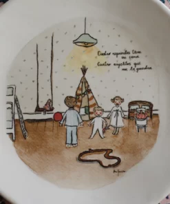 Plato de cerámica en color blanco roto con dibujo de la artista y colaboradora Ana Gusano. Pertenece a nuestra edición limitada de “escenas en familia”.