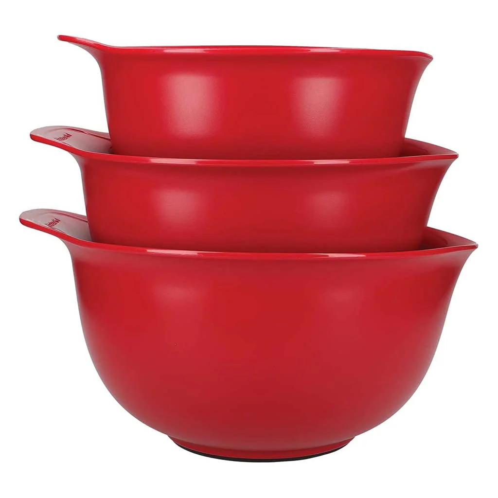 Mezcla y prepara tus recetas con el Set de 3 boles mezcladores KitchenAid. Este juego de cuencos apilables de 3 tamaños distintos, es de lo más versátil. De gran calidad y en el icónico color rojo de la marca, ¡son el complemento ideal para tu KA!
